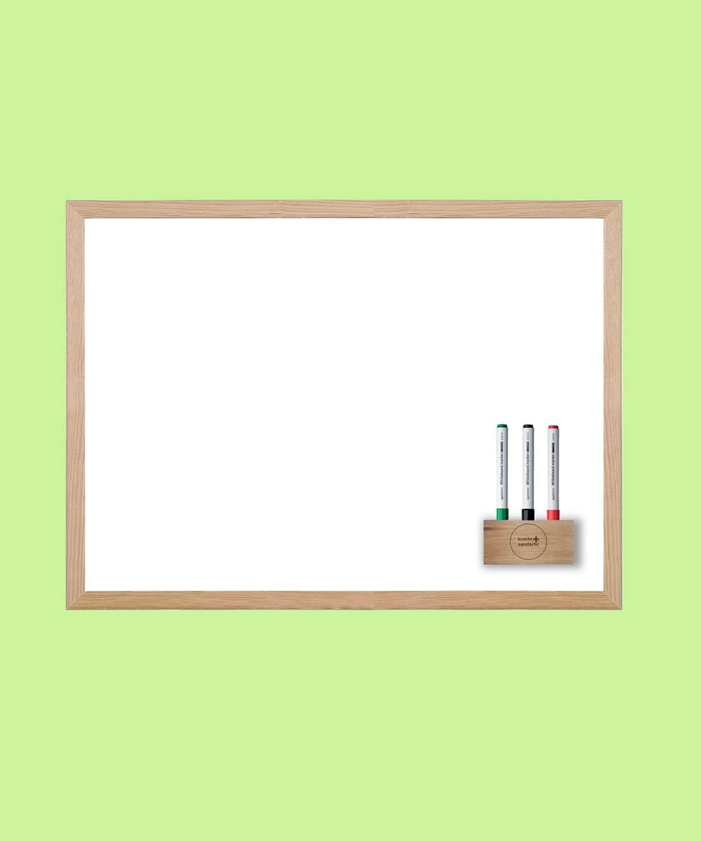 Eigenlijk zou iedereen met ADD en ADHD een whiteboard moeten hebben. Het helpt je met structuur aanbrengen in je leven en overzicht te krijgen over je ideeën. Maar de meeste whiteboards zien er uit alsof ze rechtstreeks uit een stoffig kantoor zijn gehaald. Dit whiteboard is gemaakt met een kwaliteit eikenhouten frame en ook het stiftenblok is gemaakt van hoogwaardig eikenhout. Daardoor heeft het een aangename uitstraling en is het een mooie toevoeging bij ieder interieur. Zo brengen we overzicht en design bij elkaar.